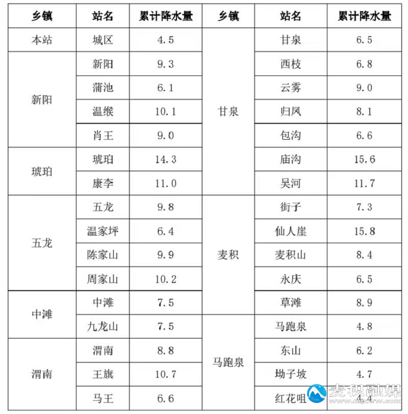 麦积新闻网:(2026-03-17 16:45:53) 来源:麦积区气象局 作者:受冷空气和西南暖湿气流共同影响,3 月 16 日夜间开始我区普降小到中雨。截止 17 日 15 时最大降水量出现在伯阳镇石门,为 15.8 毫米,目前降水过程已基本结束。此次降水天气过程,对土壤增墒、春耕春播、越冬作物返青、降低森林火险非常有利,但道路湿滑对交通运输出行等有一定影响。现将各地截止 17 日 15 时累计降水量反映如下(单位:毫米):
